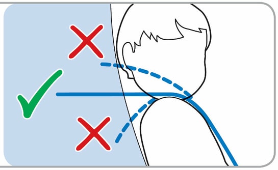 Der Gurt sollte auf der Höhe der Schultern sein. Wichtig ist auch, dass die Gurte an keiner Stelle verdreht sind.
