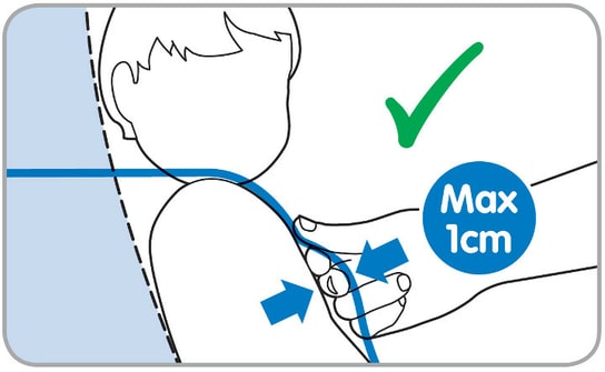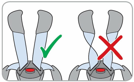 • Zieh den Hosenträgergurt im Kindersitz fest. Wenn zwischen dem Hosenträgergurt und der Brust Deines Kindes ein Finger Platz ist, ist er stramm genug.